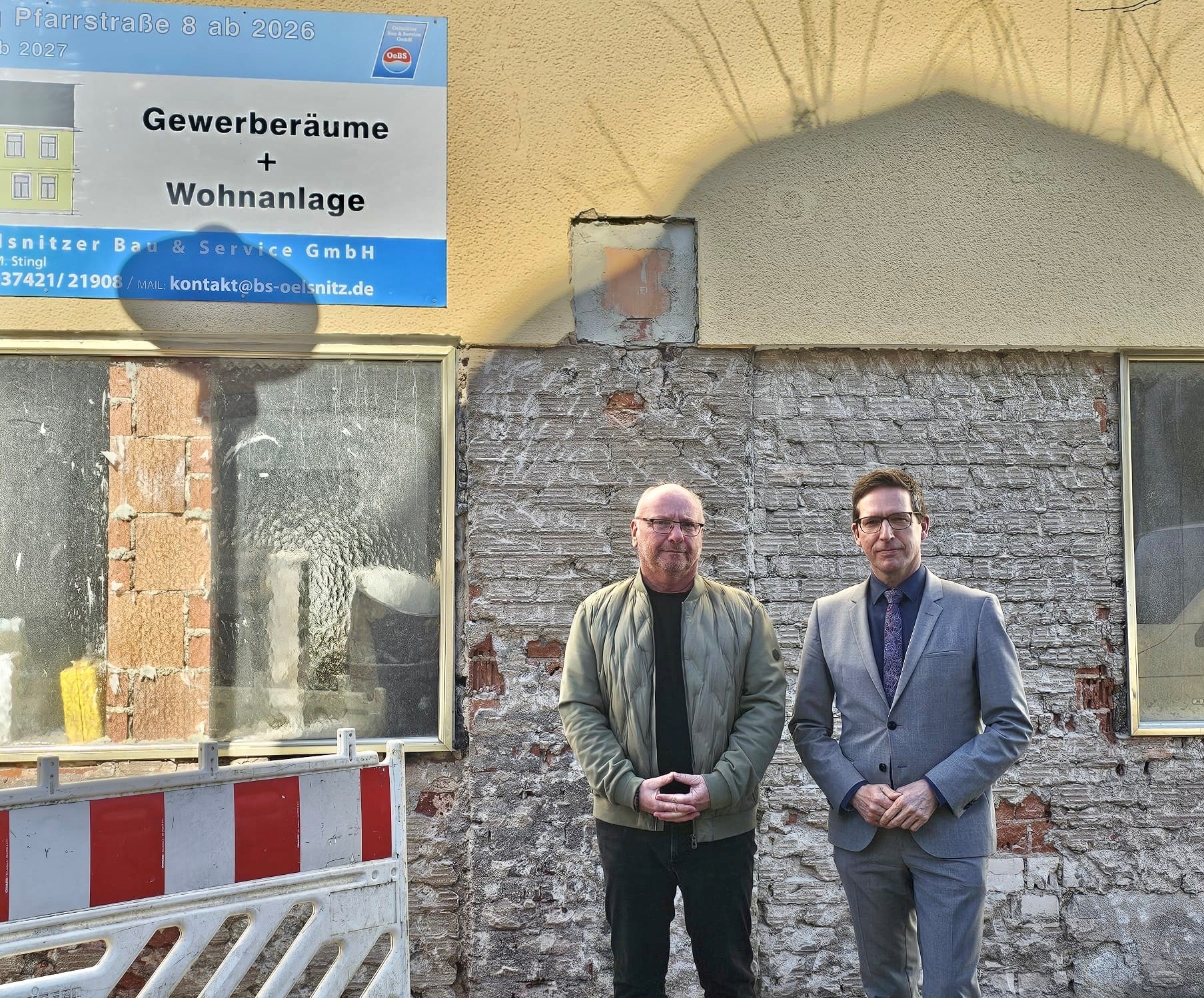 Bauunternehmer Matthias Stingl und 1. Bürgermeister Michael Abraham vor dem Sanierungsobjekt Pfarrstraße 8 in Rehau.